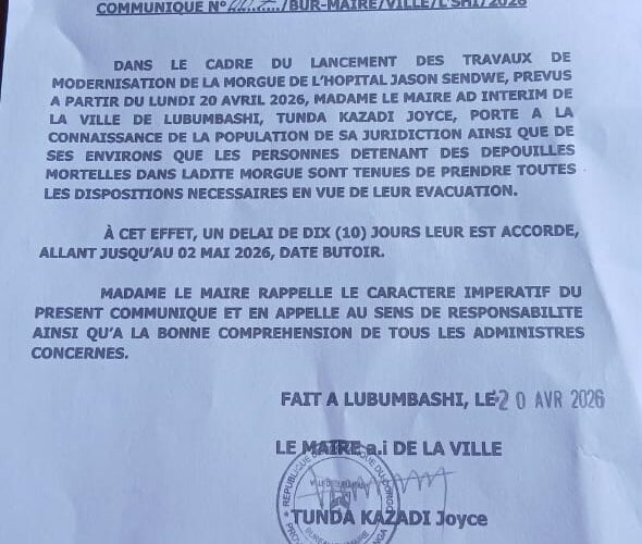 La mairie de Lubumbashi a fixé un délai de dix jours aux familles ayant des dépouilles à la morgue de l’hôpital général de référence Jason Sendwe pour procéder à leur … Read More
